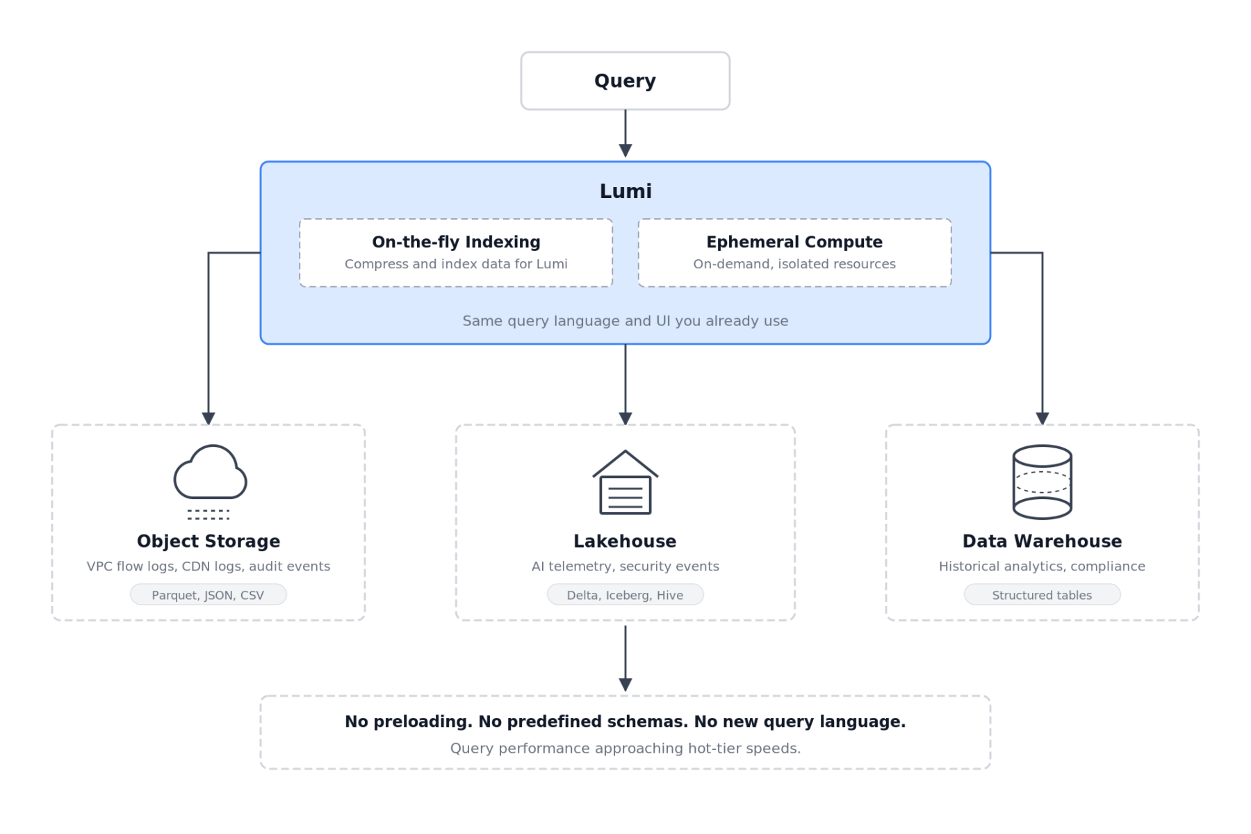 For data sitting in cloud storage, lakehouses, or data warehouses, Lumi queries it exactly where it sits, with the same query language and UI you already use for everything else.