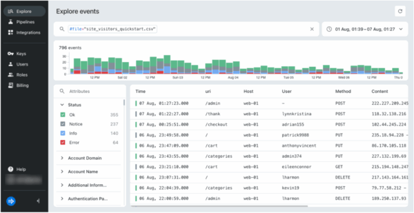 The Explore view shows your uploaded logs, scoped to the last 7 days. Customize the view just like you would in Splunk: